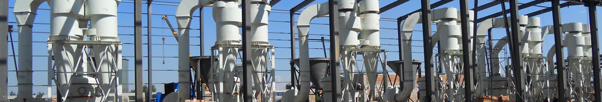 大塊物料經顎式破碎機破碎到所需粒度后,由提升機送至儲料斗,再由皮帶機將物料均勻定量連續地送入2臺MTW175歐版磨的主機磨室內進行研磨。粉磨后的物料被風機氣流送入選粉機進行分級,在選粉機葉輪的作用下,不符合細度要求的物料落入磨室內重新碾磨,合格的物料則經空氣斜槽進入旋風集粉器內,進行分離收集,經排料裝置排出即為成品粉體。